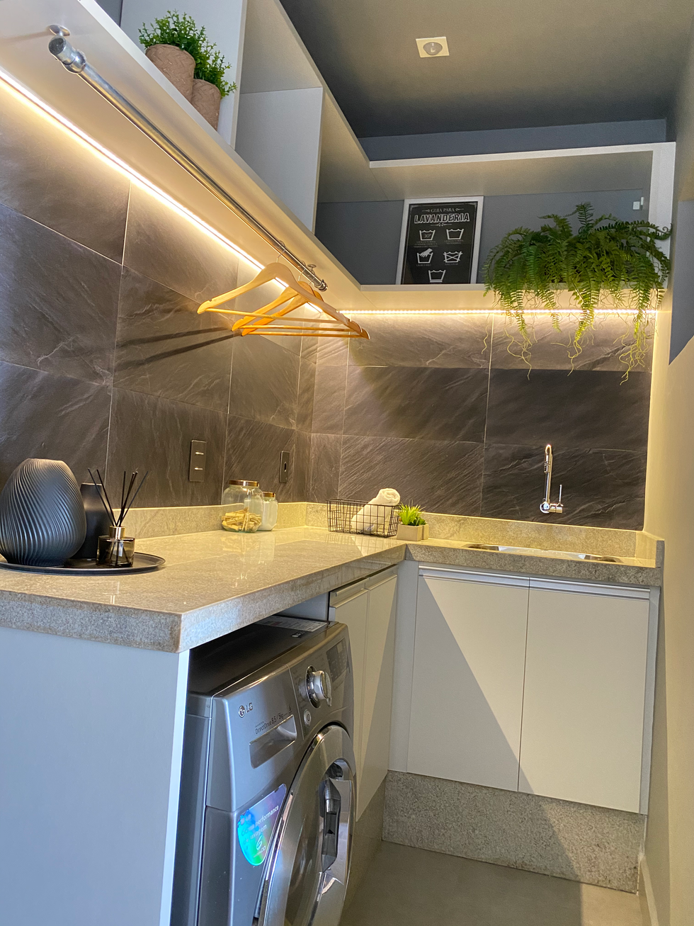 Foi produzida uma bancada em L para embutir o tanque inox, a lava e seca e a marcenaria.
